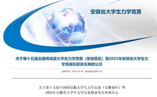近日,由安徽省教育厅主办的第十五届全国周培源大学生力学竞赛(安徽赛区)暨2025年安徽省大学生力学竞赛成绩公布。我校参赛的9名选手全部获奖,其中一等奖1项、二等奖3项、三等奖5项,本次竞赛我校首次获得一等奖,实现了历史性突破。