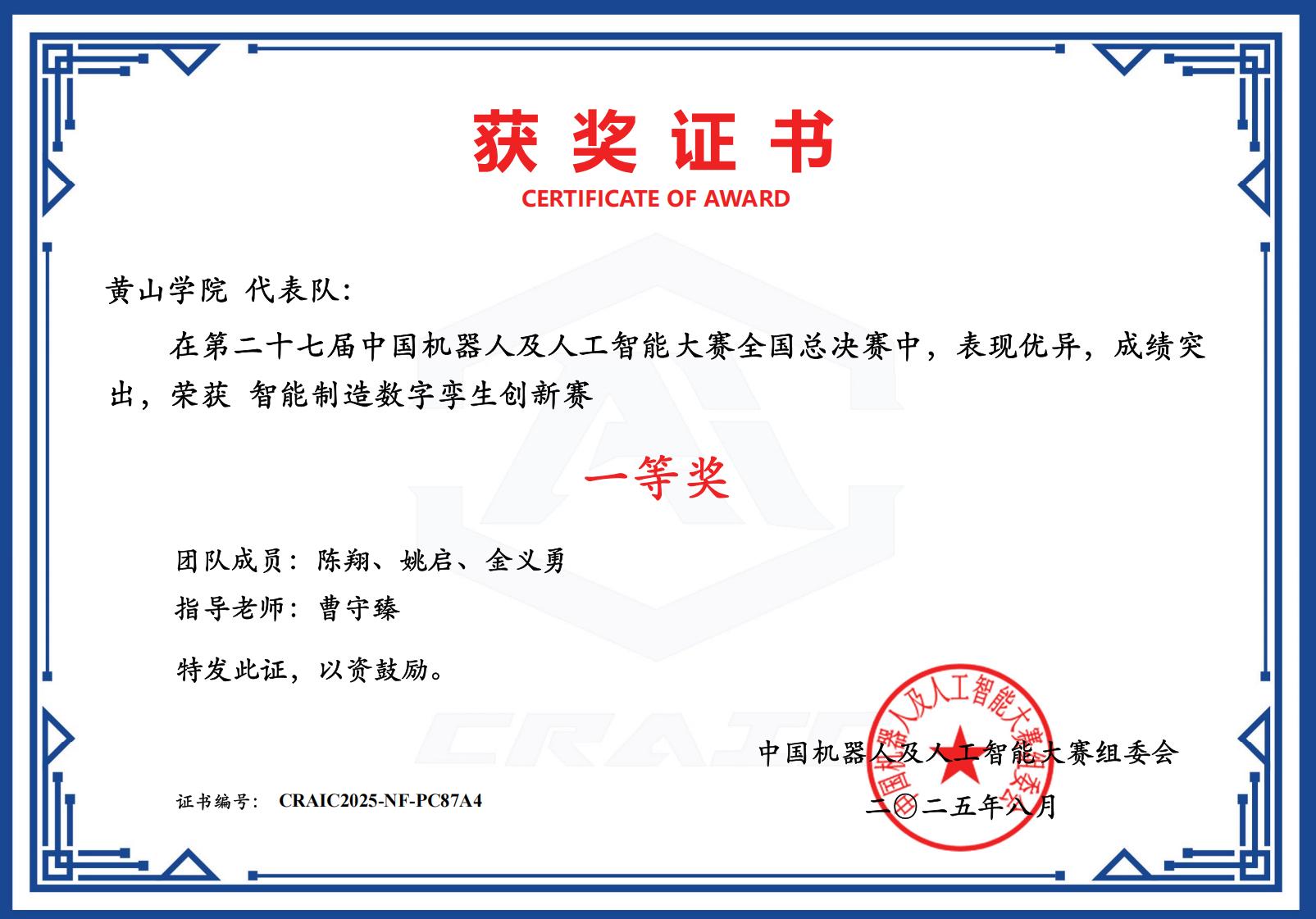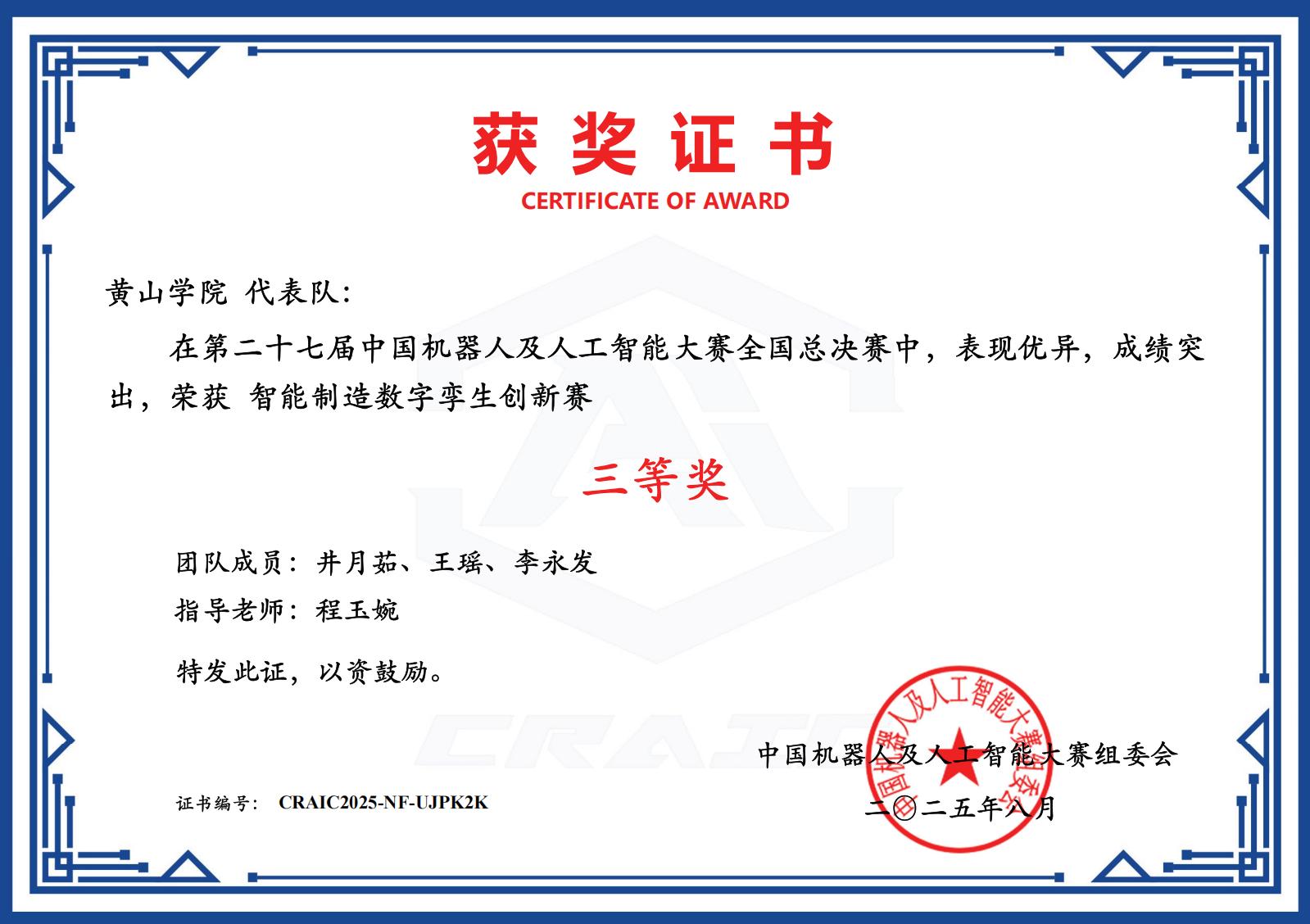 8月5日,第二十七届中国机器人及人工智能大赛全国总决赛圆满落幕。在线买世界杯平台“恐龙救援队”和“三角函数队”代表学校参加智能制造数字孪生创新赛道的角逐,最终“恐龙救援队”荣获一等奖,“三角函数队”获得三等奖。