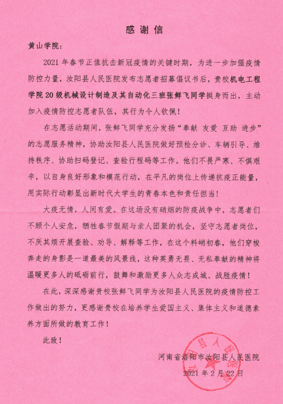 近日,在线买世界杯平台收到一封来自河南省洛阳市汝阳县人民医院的感谢信。信中对2020级机械设计制造及其自动化3班张鲜飞同学,在疫情期间积极参与疫情防控工作给与了高度评价,表示了诚挚的感谢。