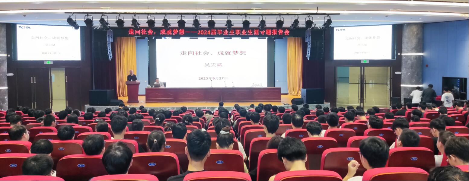 吴尖斌的报告从关于专业、就业和职业,走向未来--个人素养,走向未来-思维方式,企业文化与精神等方面展开,他以企业家的视角阐述了专业-就业-职业的内在联系,强调企业更关注毕业生实践经验、实践能力和跨界学习的能力,希望学生要热爱专业,強化实践,提升技能,学有所用,实现高质量就业;从企业选人用人的角度,他指出企业对毕业生的个人修养主要体现在忠诚、格局、自信、阳光、担当,希望毕业生提升个人修为,胸怀“国之大者”,勇于担当作为;从企业发展角度,他指出,面对竞争,要勇于创新求变,希望学生要有在困境中求生存,逆境中谋发展的思维方式。